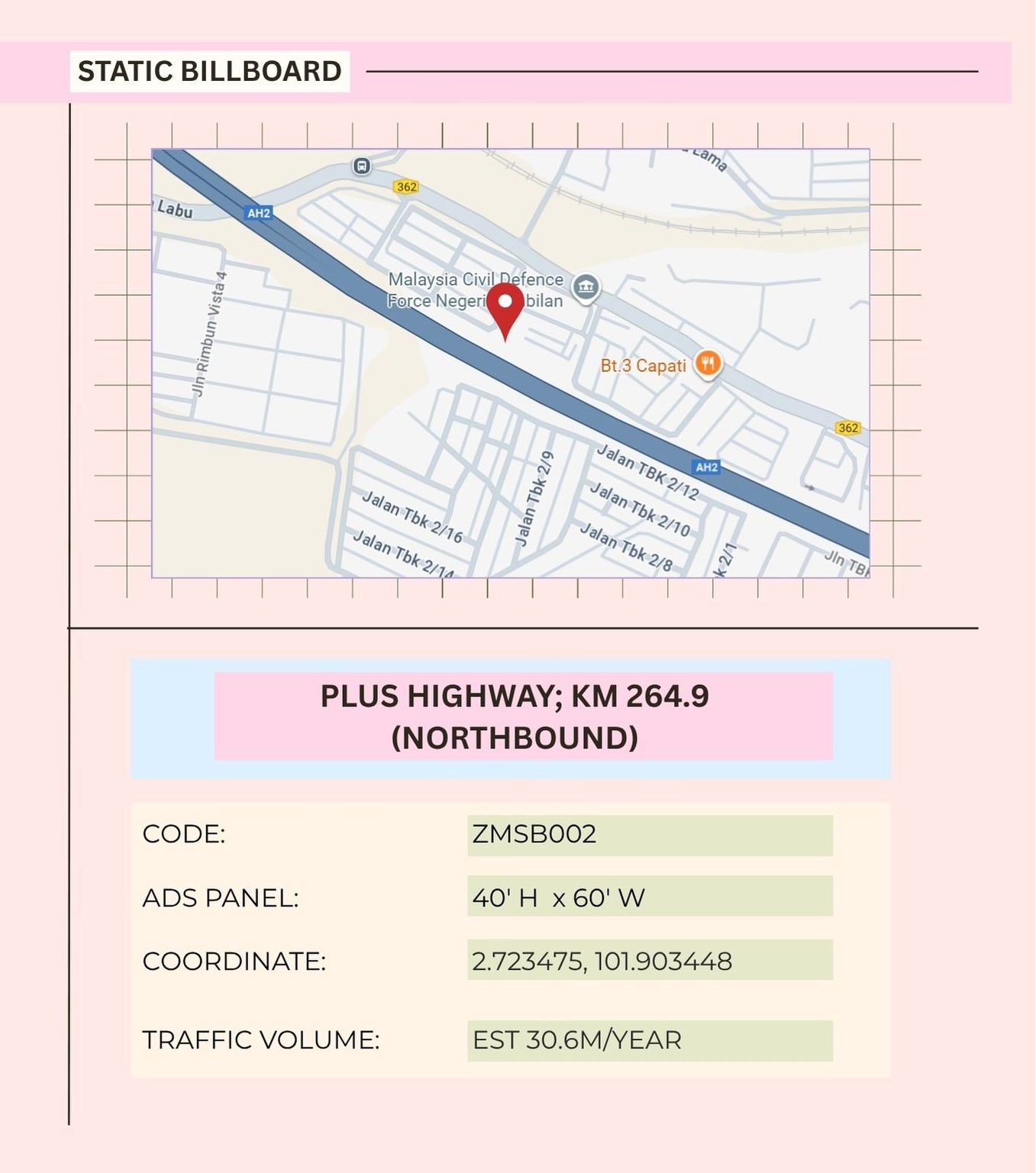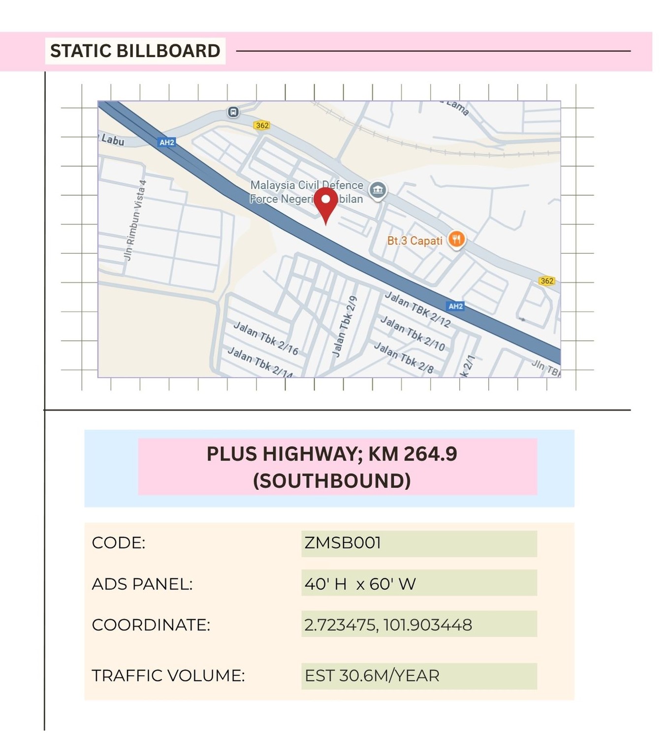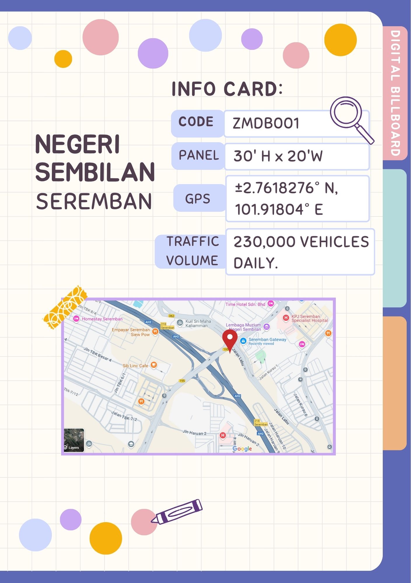 LOCATED NEAR THE BUSY SEREMBAN GATEWAY JUNCTION, THIS BILLBOARD SITE ENJOYS EXCEPTIONAL VISIBILITY TO BOTH LOCAL CITY TRAFFIC AND HIGHWAY COMMUTERS. THE AREA SERVES AS A KEY CONNECTION POINT BETWEEN SEREMBAN TOWN, THE PLUS HIGHWAY, AND THE LABU–SENAWANG ROUTES. WITH STEADY TRAFFIC FLOW THROUGHOUT THE DAY, AND HEAVY CONGESTION DURING WEEKENDS AND PEAK HOURS, THIS LOCATION PROVIDES EXTENDED VIEWING TIME AND HIGH-IMPACT EXPOSURE FOR ADVERTISERS. SURROUNDED BY COMMERCIAL HUBS, RESIDENTIAL AREAS AND LIFESTYLE OUTLETS, IT IS AN IDEAL SPOT FOR BRANDS TARGETING URBAN CONSUMERS AND TRAVELLERS ENTERING SEREMBAN CITY.
